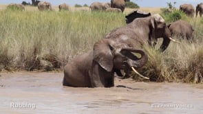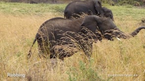 Rubbing the head, ears, legs or body against a tree trunk, log, stump or boulder, or on another elephant, often after Mud-Wallowing or Mud-Splashing. Musth males use Rubbing to mark a tree or the ground (when mud wallowing) with Temporal-Gland-Secretion and as a visual display. Rubbing may be so vigorous that the male departs with bark and debris on the side of his face. Dissected temporal glands have been found to have pieces of bark embedded deep inside them.