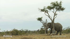 Rubbing the head, ears, legs or body against a tree trunk, log, stump or boulder, or on another elephant, often after Mud-Wallowing or Mud-Splashing. Musth males use Rubbing to mark a tree or the ground (when mud wallowing) with Temporal-Gland-Secretion and as a visual display. Rubbing may be so vigorous that the male departs with bark and debris on the side of his face. Dissected temporal glands have been found to have pieces of bark embedded deep inside them.
