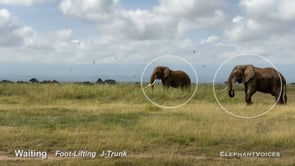 Standing idly, lingering, loitering until other elephants either catch up or are alerted to the signallers attempt to initiate movement; contextually this posture is obvious as the Waiting individual is attentive (engaging in behaviors such as J-Trunk, Eye-Blinking, Ears-Stiff), often glancing back over her shoulder (Look-Back), and/or checking the others' activity by sniffing, listening and looking, and indicating her impatience by taking a few desultory steps and pausing again - Walk-Wait. This behaviour occurs in a number of different contexts.