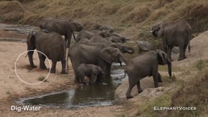 An individual swinging a forefoot foreward and backward or from side to side to dig a well to access water beneath the surface of sandy riverbeds. They may also employ the trunk to help remove sand from the well.